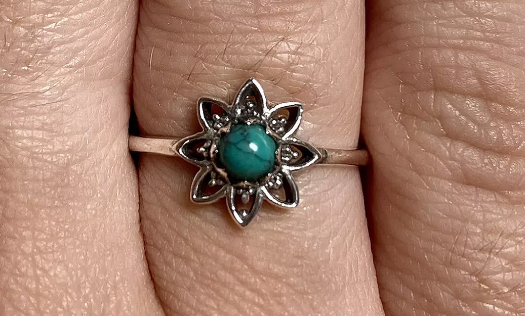 Bright, bold, and beautifully bohemian, this Turquoise Flower Ring brings a pop of color and charm to your jewelry collection. Crafted from genuine 925 sterling silver, the ring features a round turquoise gemstone at its center, framed by a delicate floral design for a fresh, nature-inspired look.