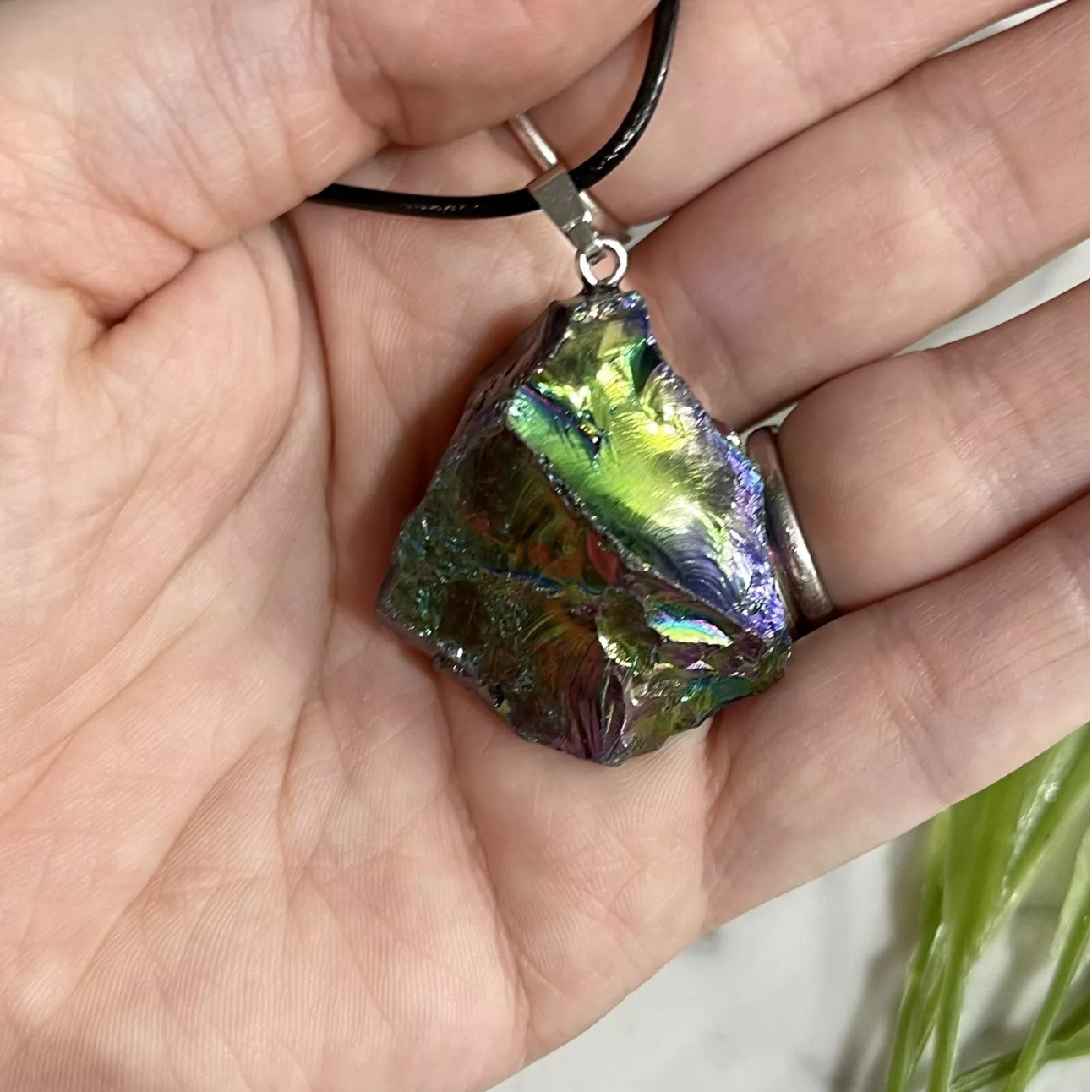 Rainbow Aura Quartz Rough Pendant | Gemstone on Cord Necklace for Healing, Joy & Love