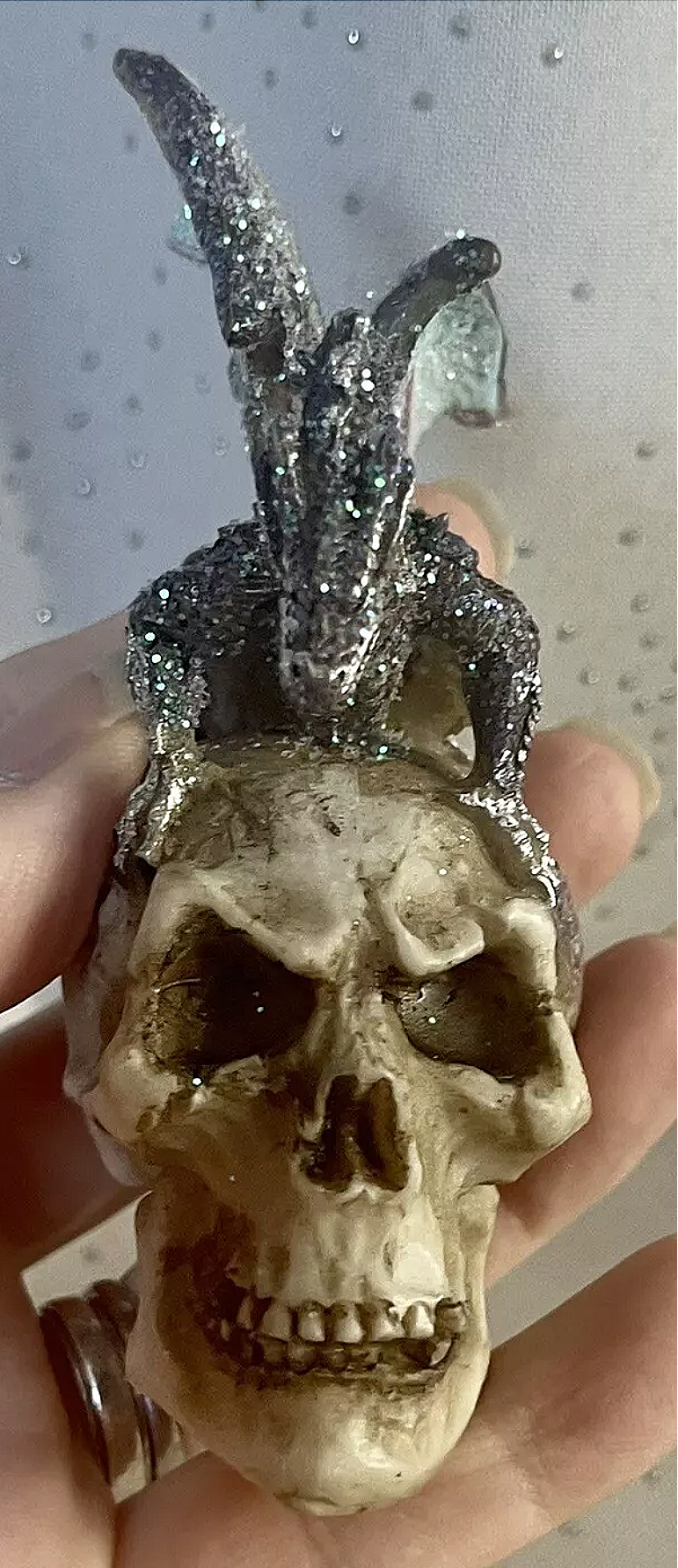 - Colors: Purple & blue glitter dragon, aged bone skull finish