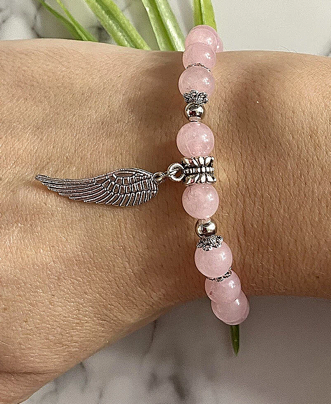 Rose quartz is known as the stone of unconditional love, resonating deeply with the heart chakra to promote emotional balance, self-love, and harmony in relationships. The angel wing charm adds a spiritual touch, representing guidance, comfort, and the presence of guardian angels.