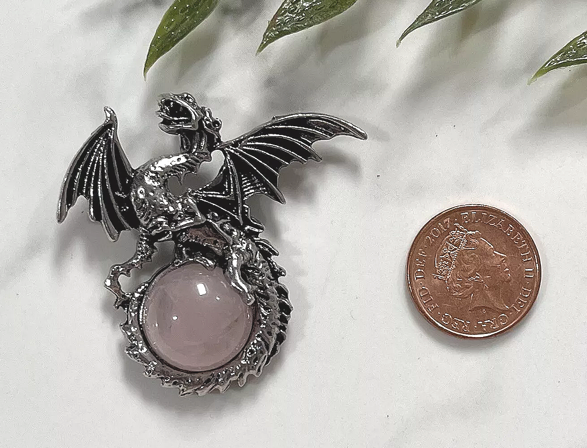 Harness the gentle energy of rose quartz and the fierce protection of the dragon with this enchanting Dragon on Ball Pendant. A polished rose quartz sphere forms the heart of the piece, symbolizing unconditional love, emotional healing, and heart chakra balance. Wrapped protectively by a finely detailed dragon, this pendant also carries the powerful symbolism of strength, guardianship, and inner transformation.