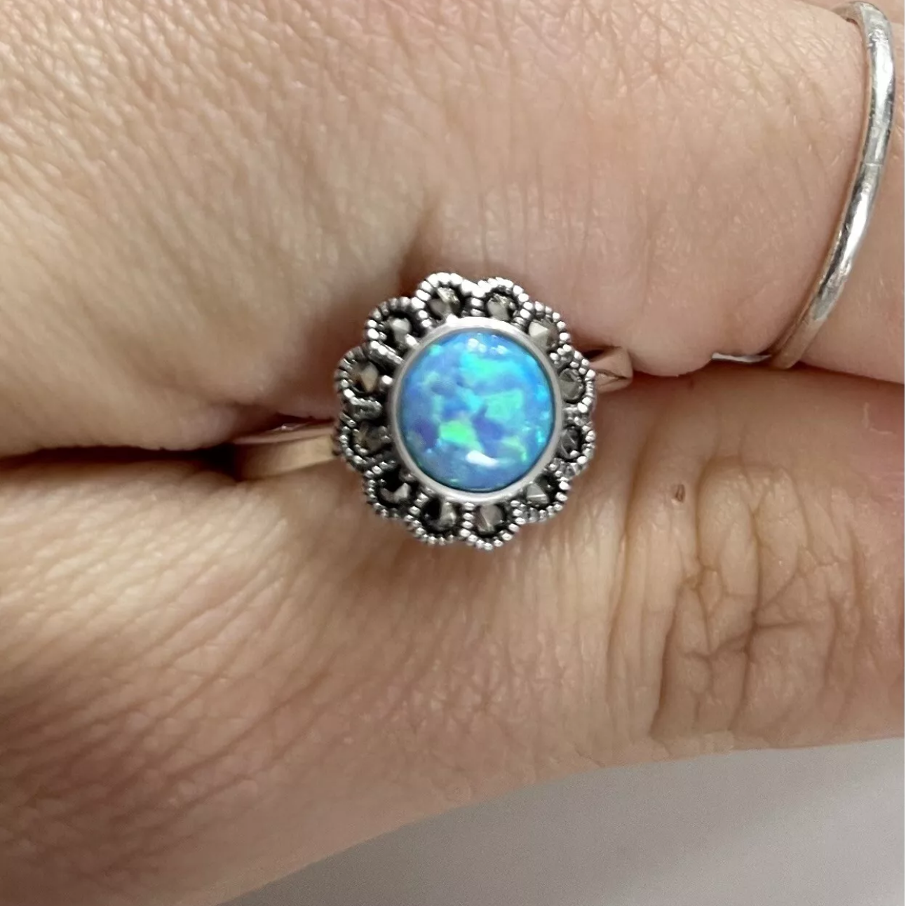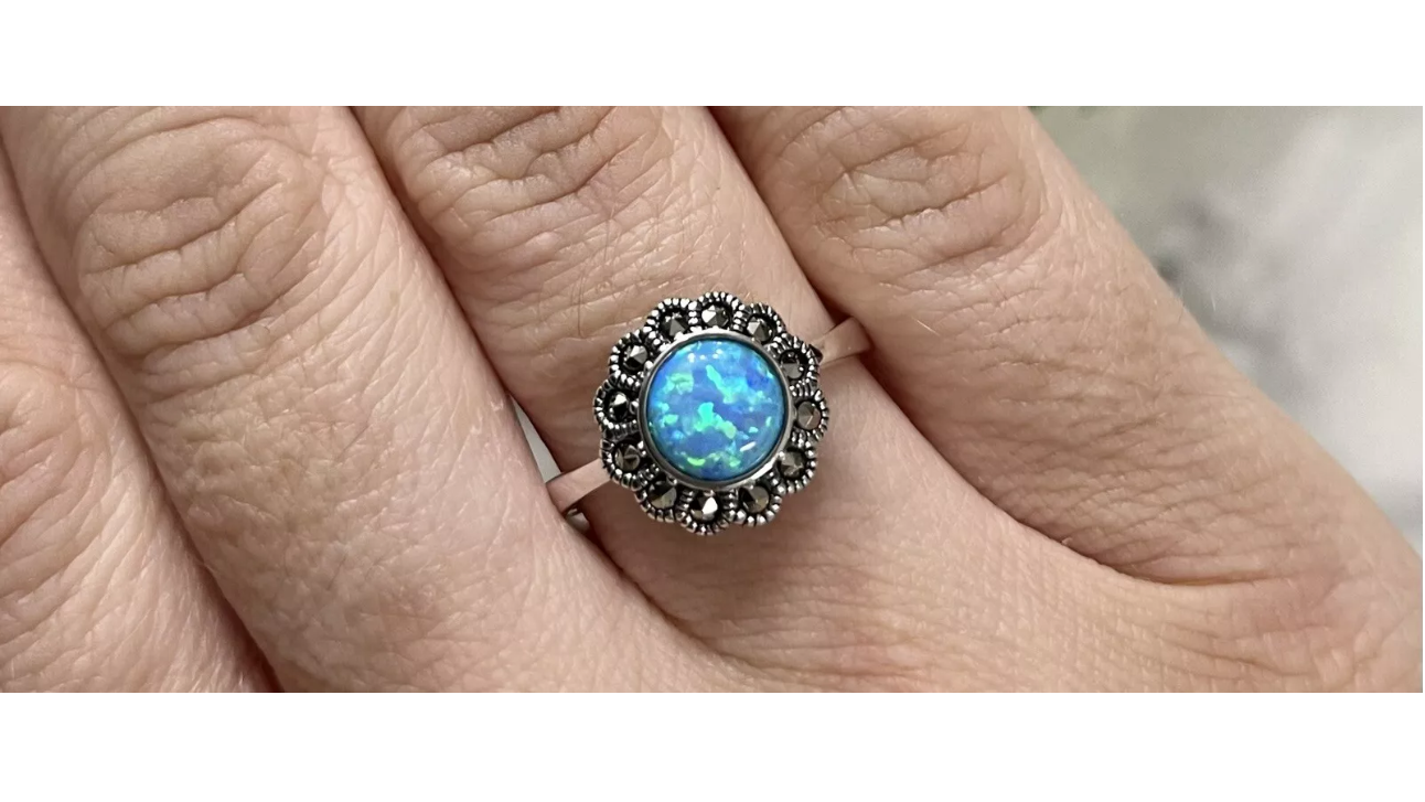 Stunning Blue Fire Opal Flower Ring with Marcasite – Sterling Silver – Size P