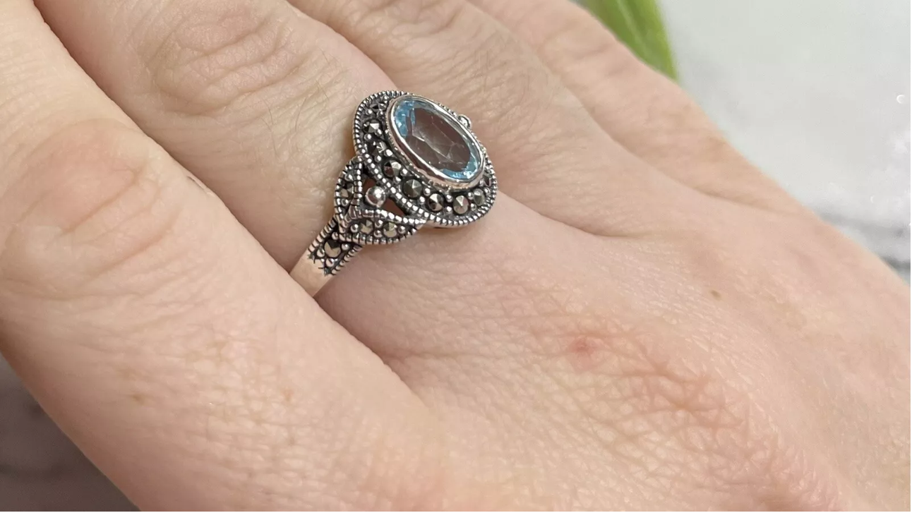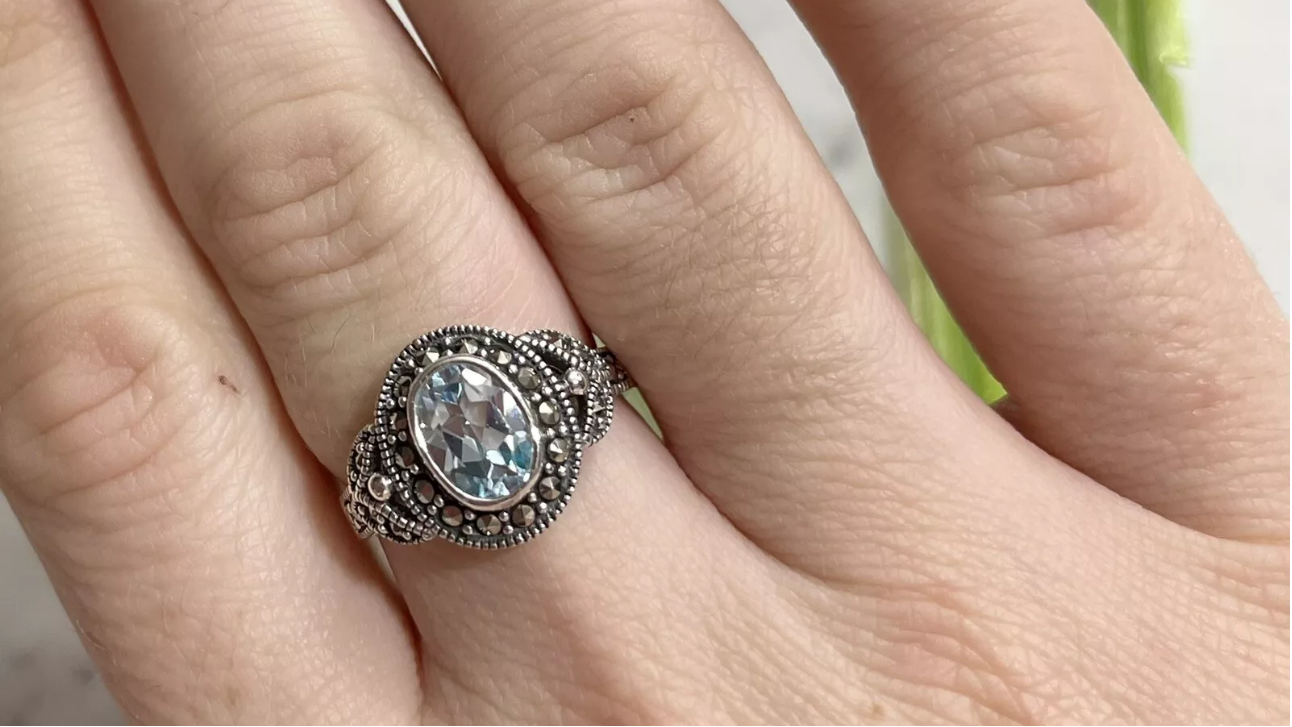 - Gemstones: Blue Topaz (center), Marcasite (accents)