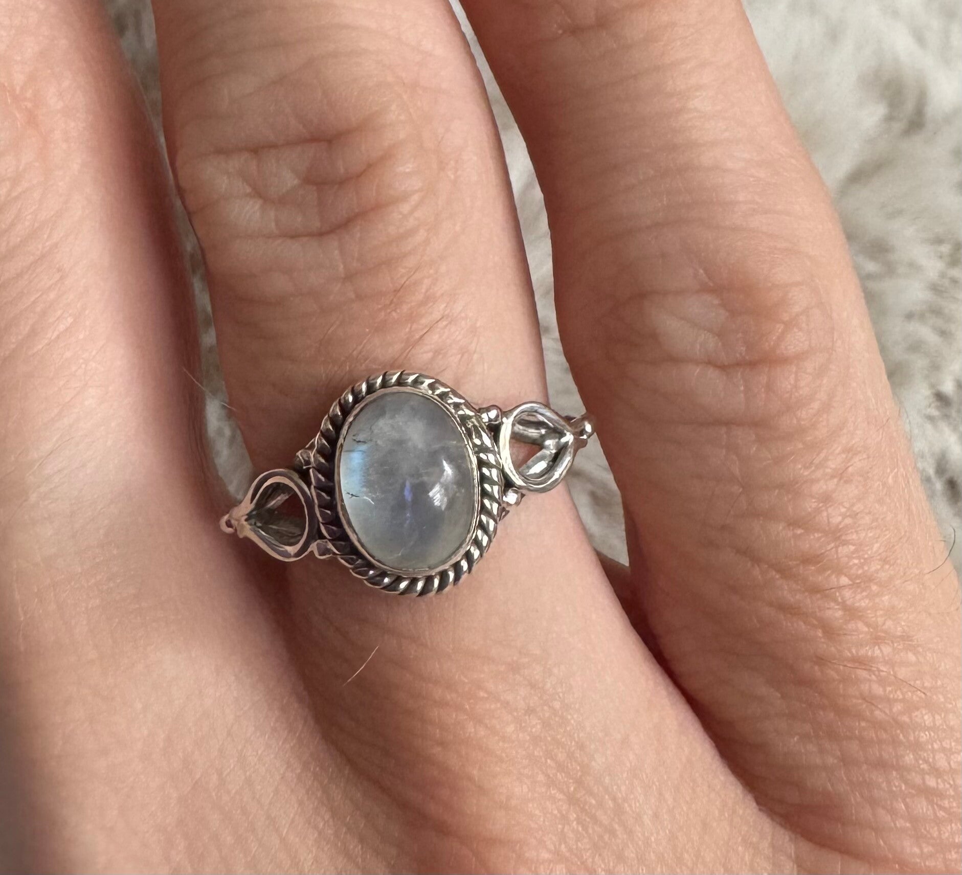 This elegant ring features a genuine Rainbow Moonstone set in high-quality 925 sterling silver. The stone displays a captivating play of colors, shimmering with blue, violet, and rainbow flashes as it catches the light. Known as the stone of intuition and inner clarity, Rainbow Moonstone is not only beautiful but also carries a touch of mystique and positive energy.